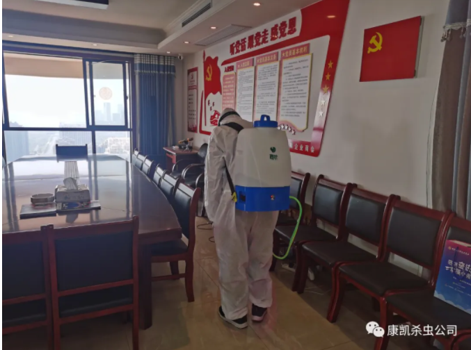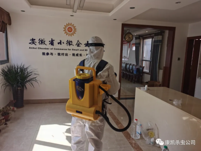 康凱環(huán)保公司技術(shù)人員服務(wù)人員進(jìn)行安徽省小微商會(huì)辦公室消毒工作: